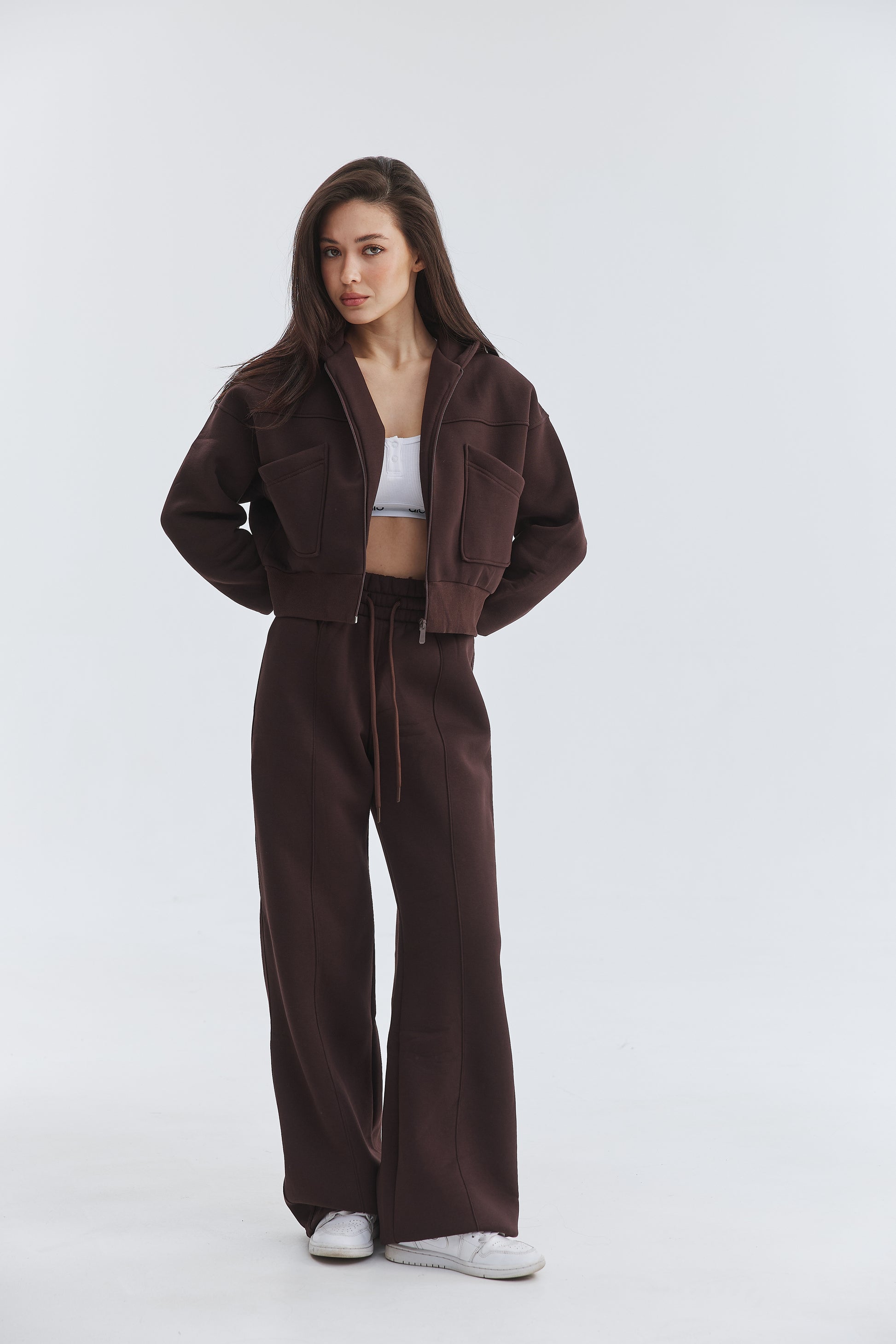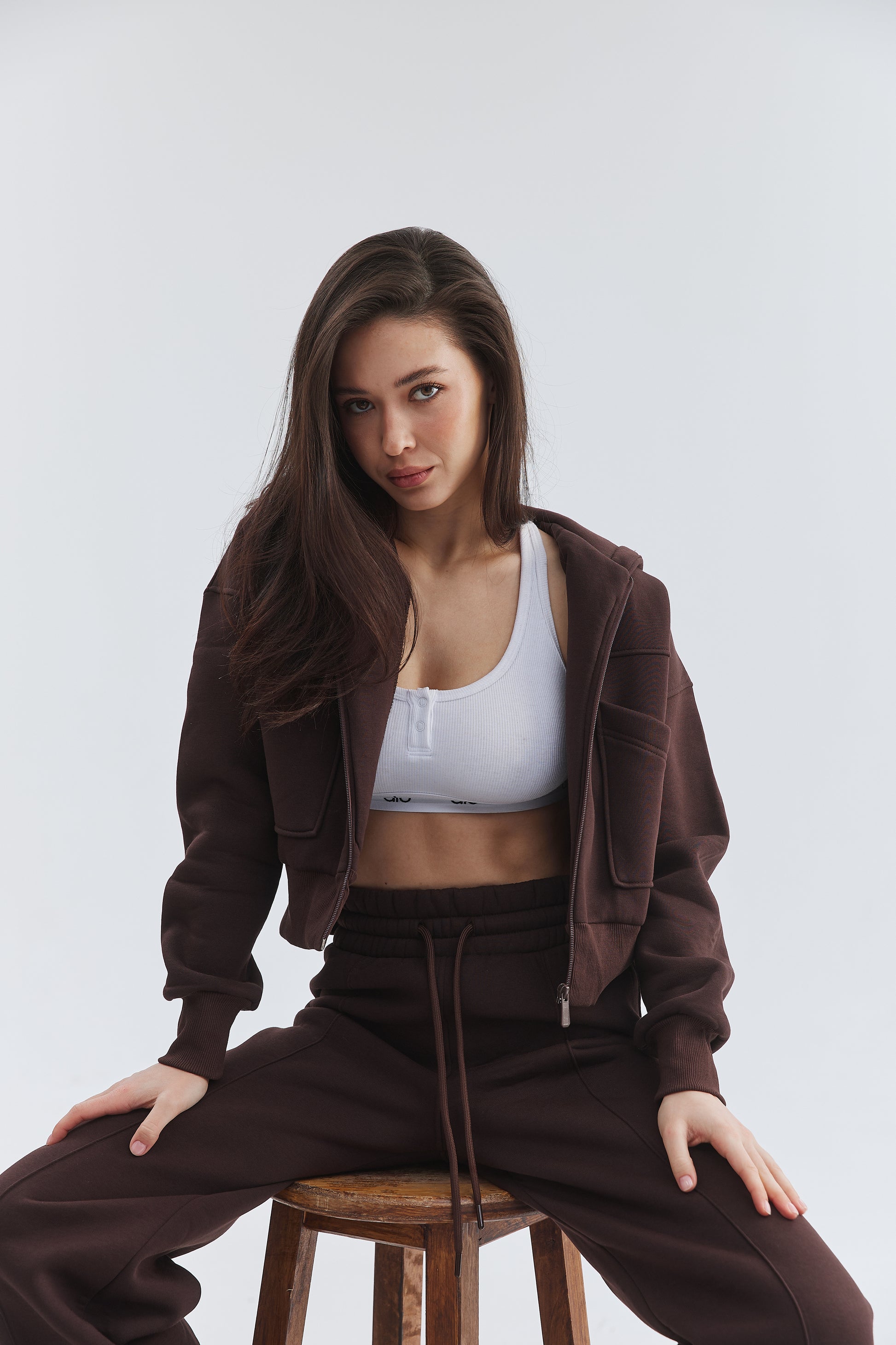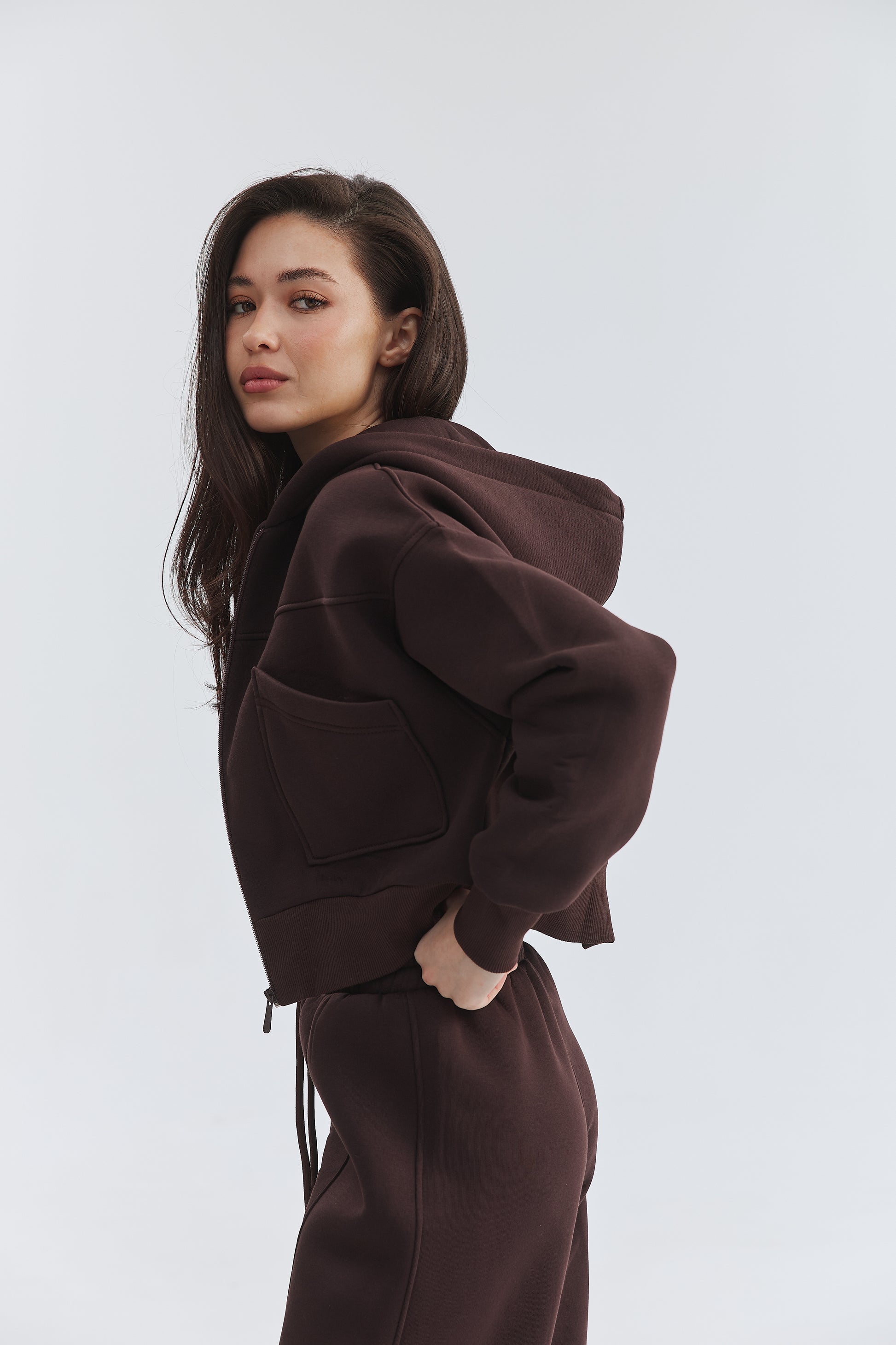 Худі з подвійним капюшоном вільного крою, є бічні кишені по переду, еластичні манжети на рукавах, по низу також рібана.