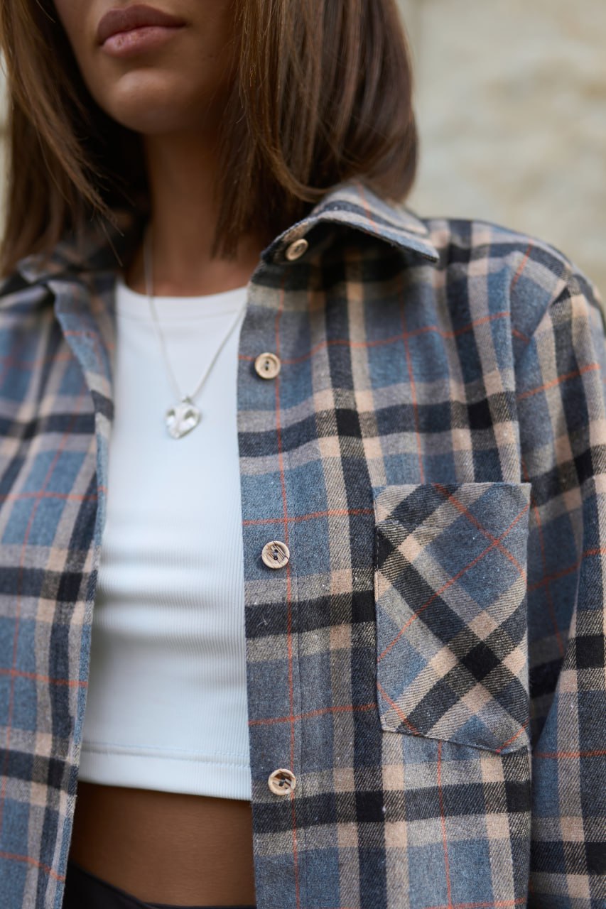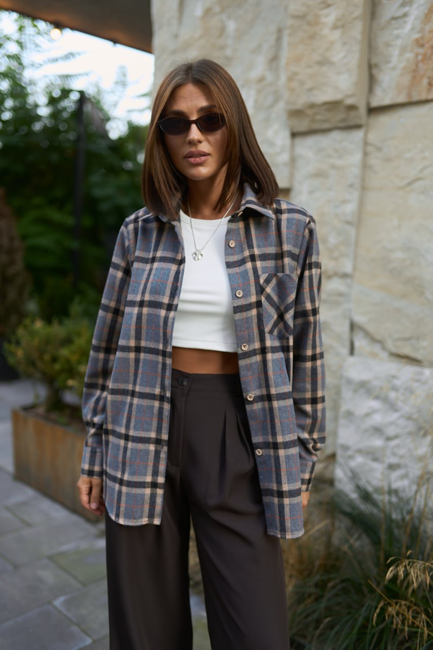 Сорочка виконана з утепленої тканини, на грудях одна кишеня, манжети та планка на матових гудзиках, відкладний комір, плече опущене