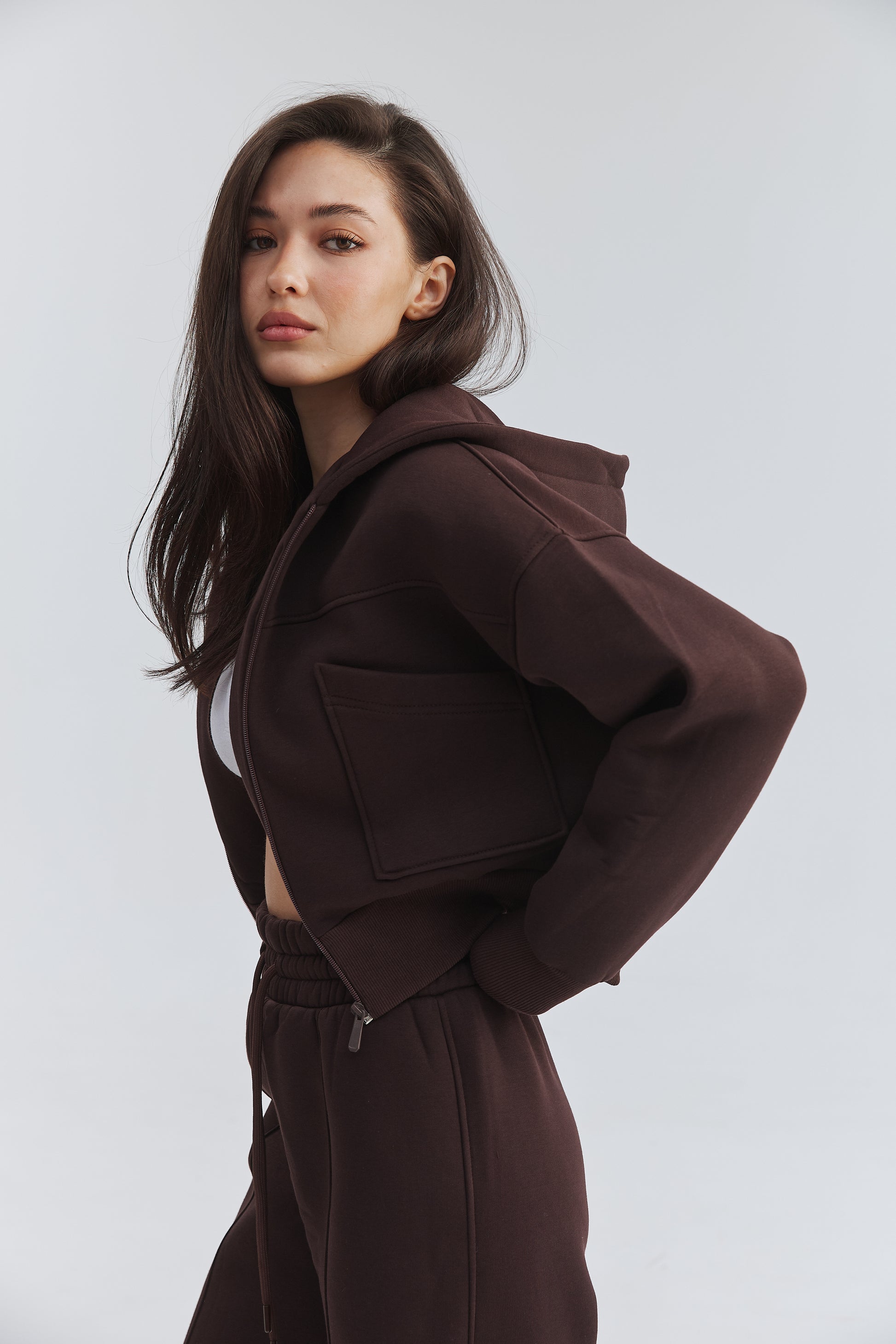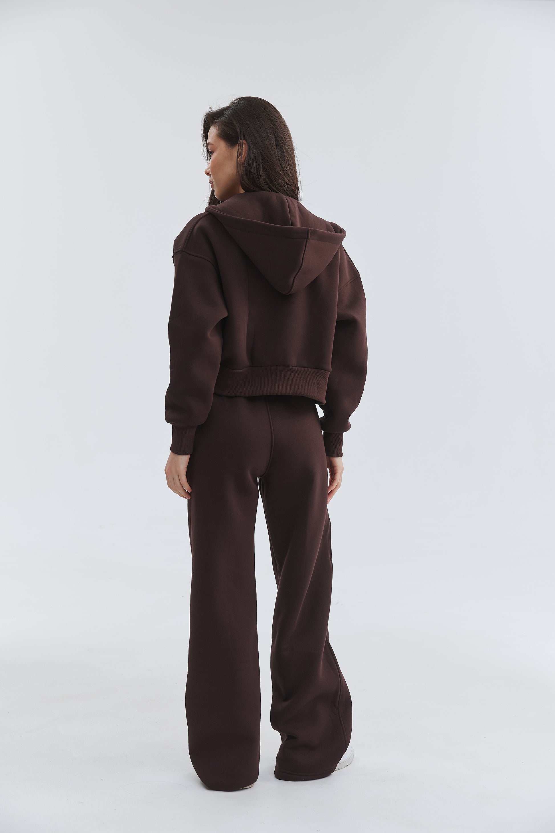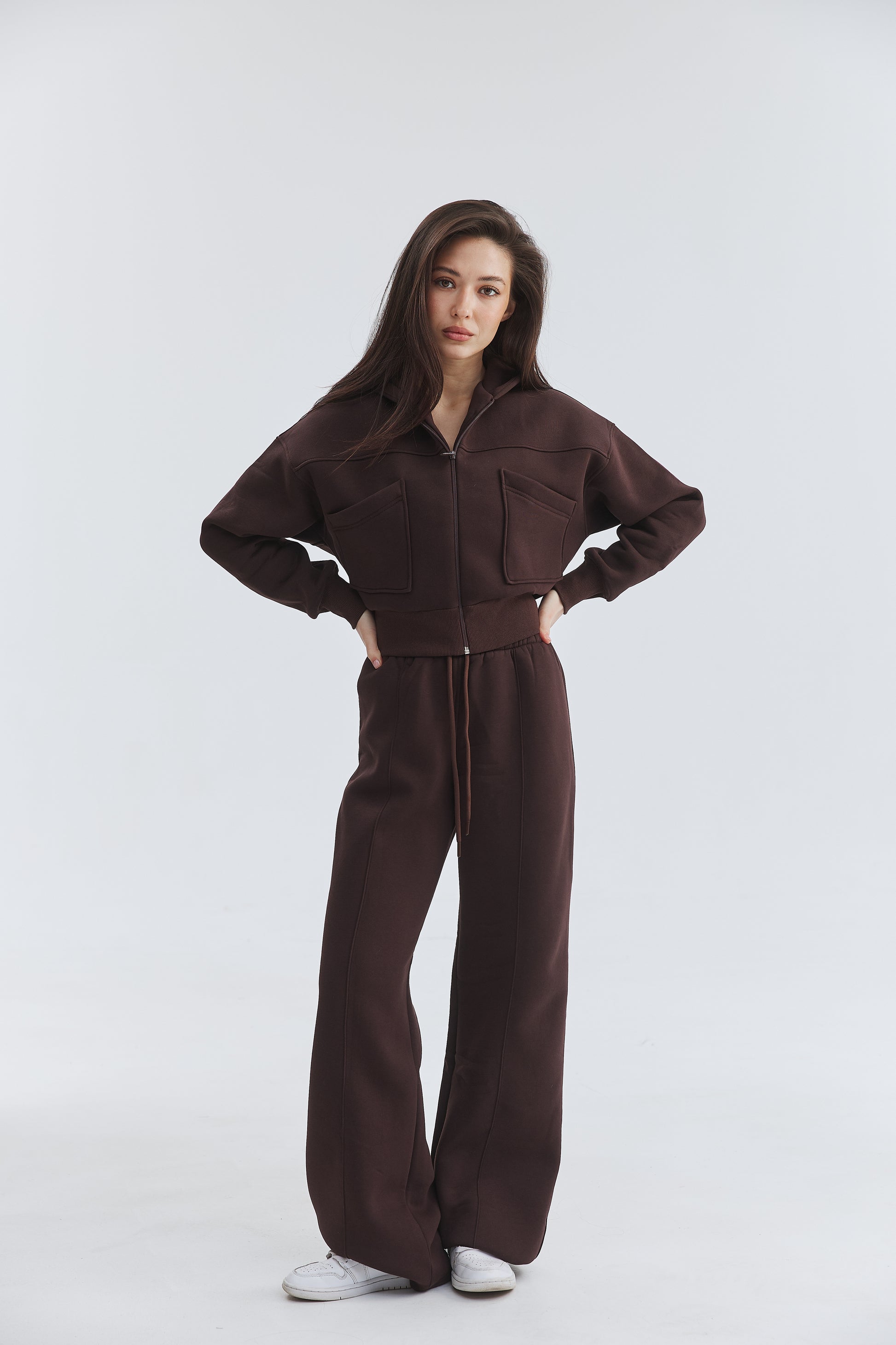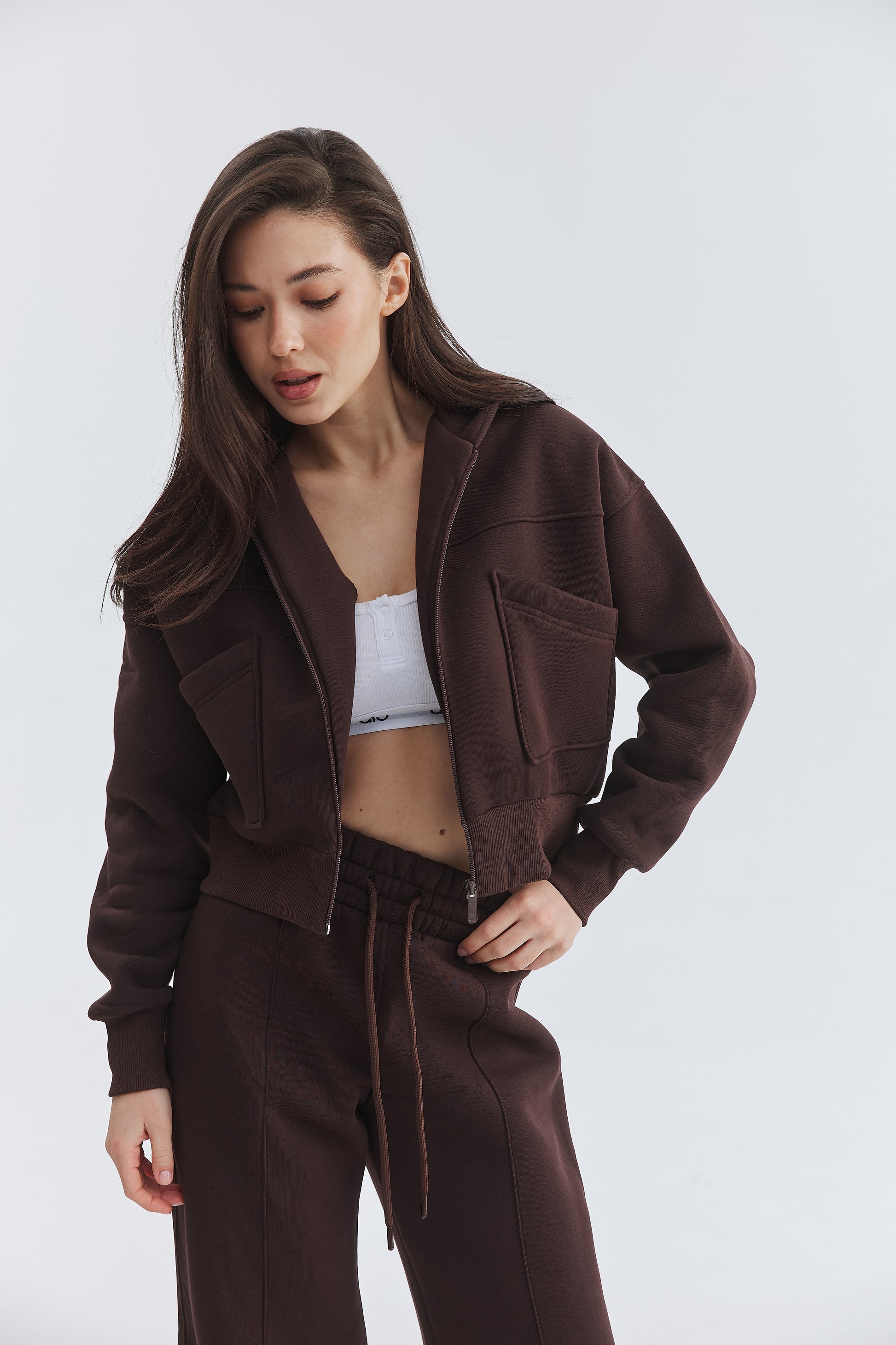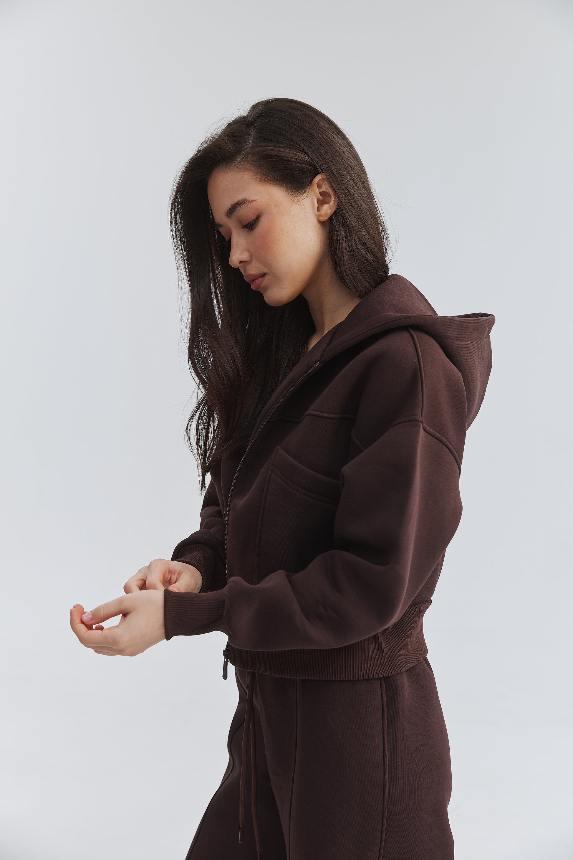 Худі прямого вільного крою, з капюшоном, на блискавці в тон костюму,по переду доповнено швами та кишенями, високі манжети з рібани